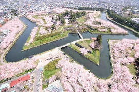 五稜郭タワーより見た櫻が満開の五稜郭 左下の赤い屋根が最上寺納骨堂 |